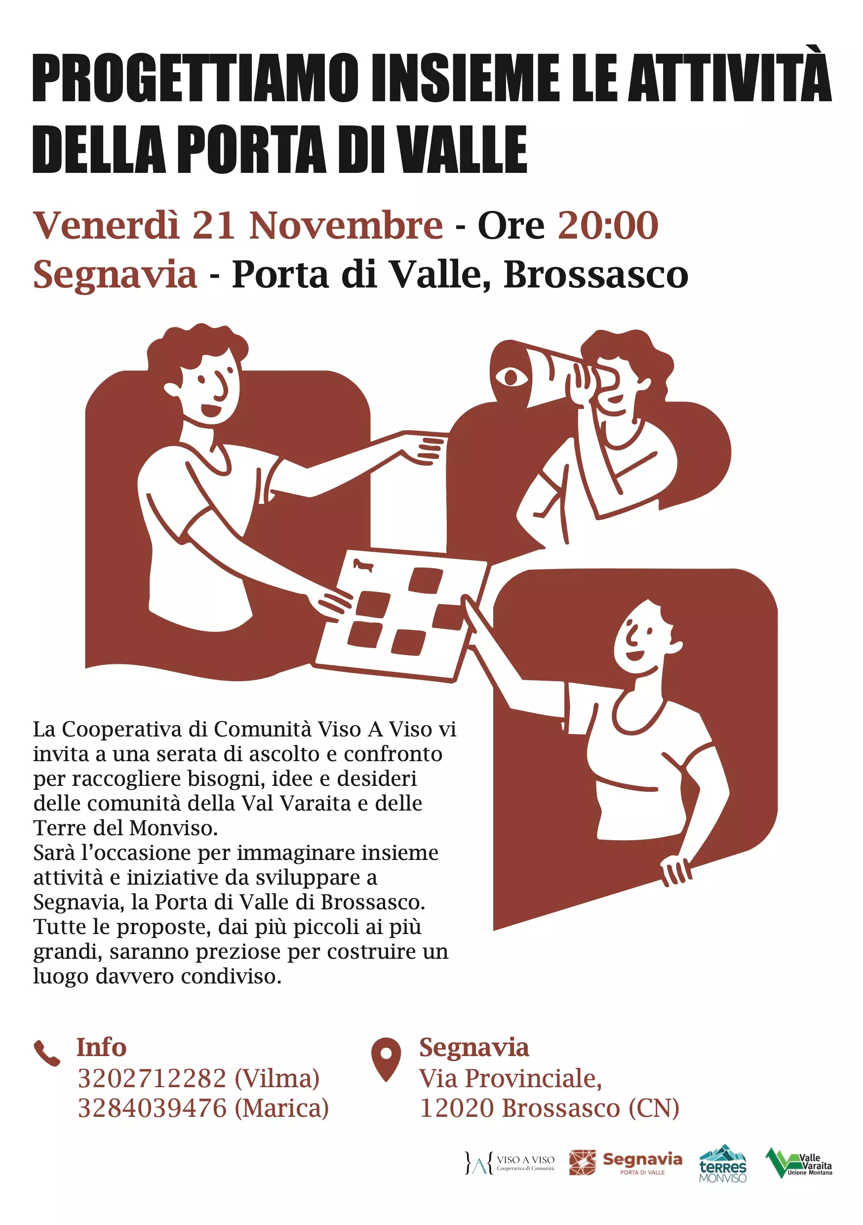 L’Unione Montana Valle Varaita invita la popolazione a partecipare all’incontro “Progettiamo insieme le attività della Porta di Valle”, in programma venerdì 21 novembre alle ore 20 presso Segnavia – Porta di Valle a Brossasco. Saranno presenti amministratori e personale dell’ente, insieme ai referenti della Cooperativa di Comunità Viso A Viso, promotrice dell’iniziativa e soggetto gestore del locale, di proprietà dell’Unione Montana Valle Varaita. L’appuntamento nasce come occasione di ascolto e confronto con le comunità della valle Varaita e del territorio Terres Monviso, per raccogliere proposte, esigenze e spunti utili alla definizione di un nuovo programma condiviso di attività da realizzare all’interno della struttura, affiancando ciò che il gestore già mette in atto. Tutte le proposte, dalle più piccole alle più grandi, saranno preziose per costruire un progetto condiviso e partecipato, in grado di rafforzare la rete territoriale costruita nell’ambito della progettazione territoriale Terres Monviso e individuare possibili opportunità di crescita sostenibile, in sinergia con gli altri attori locali.